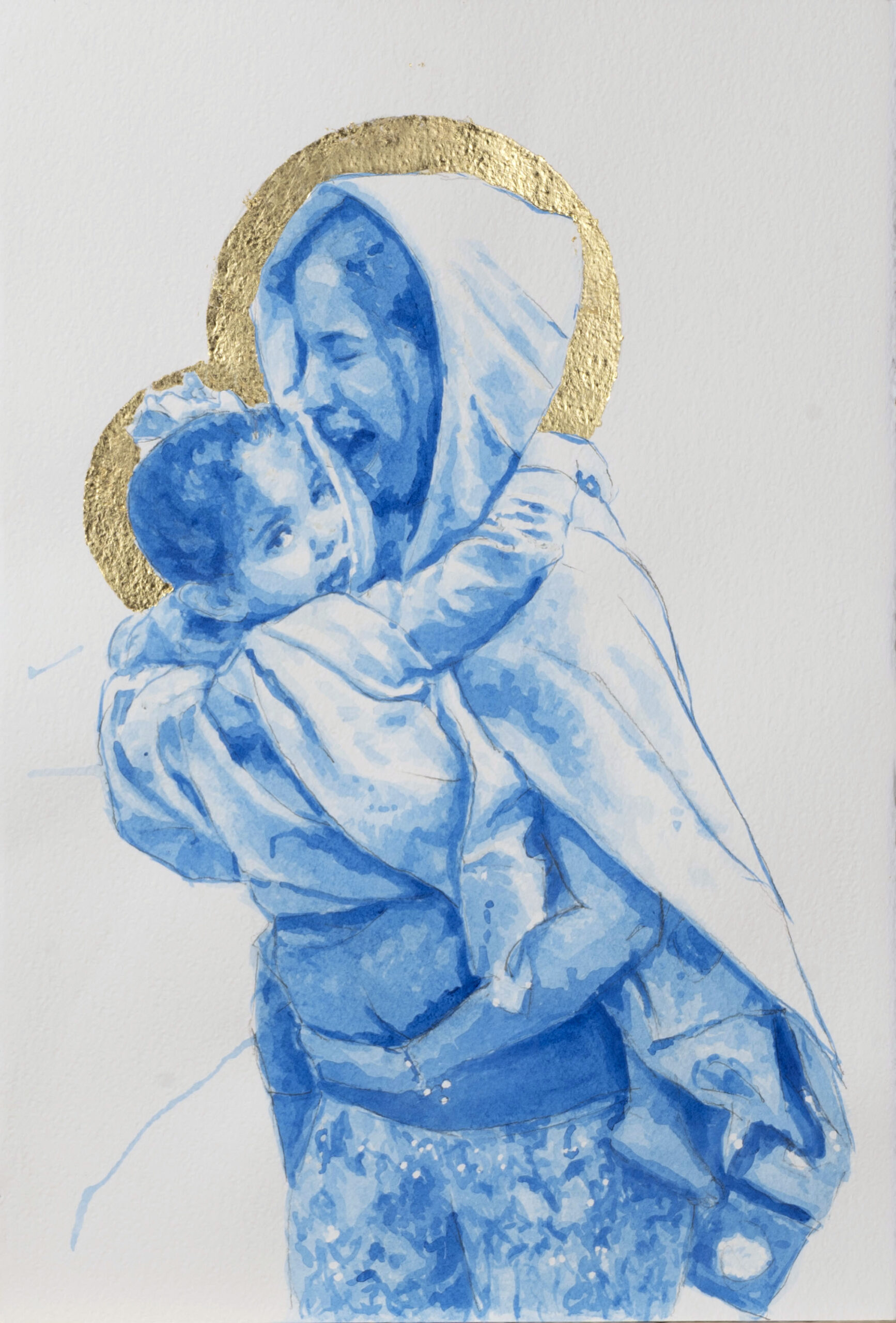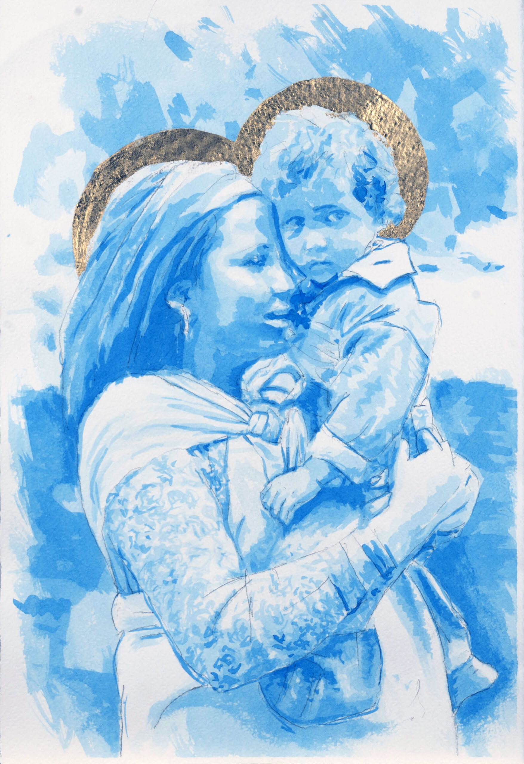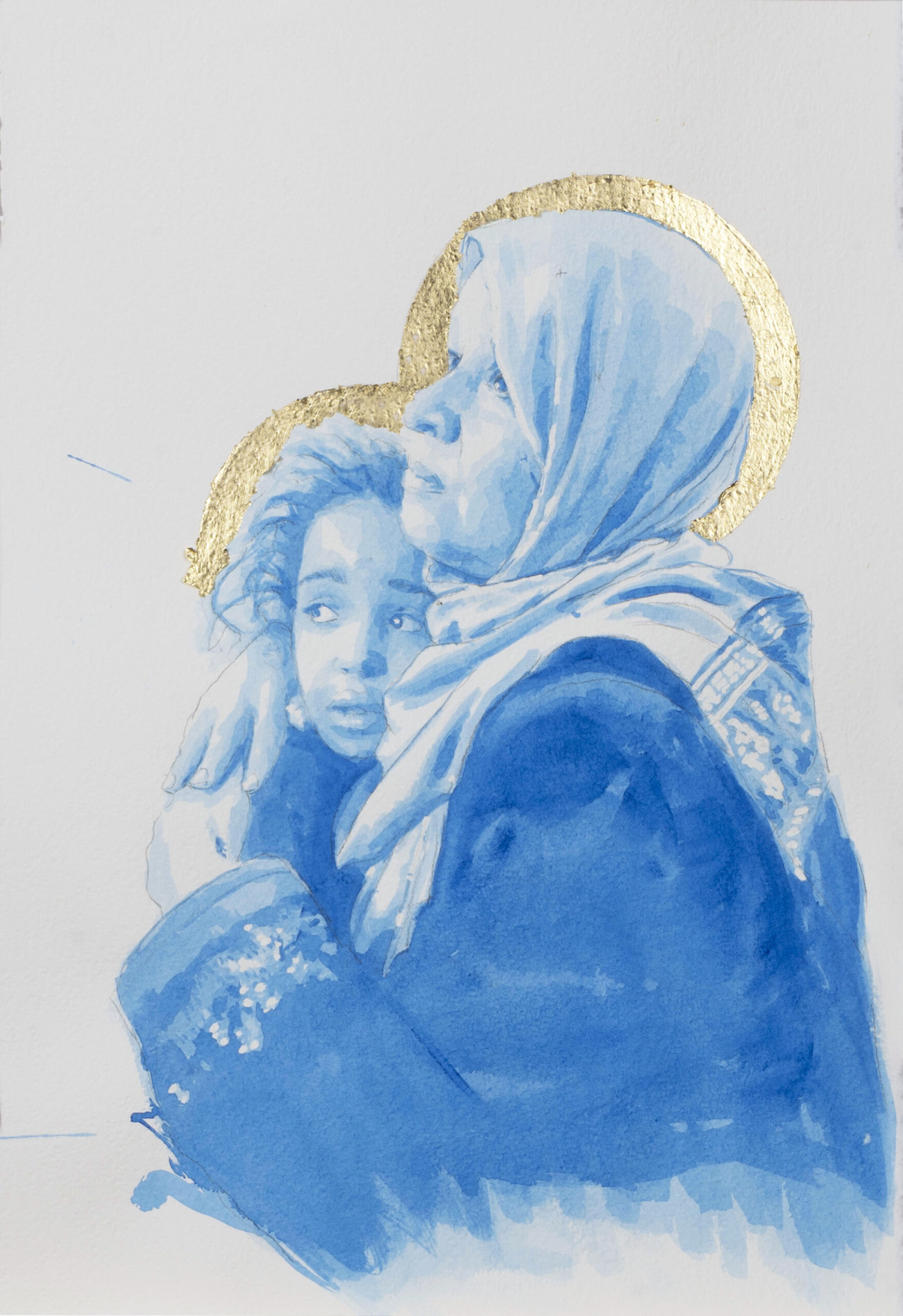 Eleison is an Ancient Greek verb which describes the visceral and intimate Love a mother feels for her child. This verb gives its name to a collection of watercolors which depict this feeling inspired by pictures of migrant mothers. The splashes of color trace the desperation, the challenge, the fears, celebrating the deepest and most powerful Love of all.