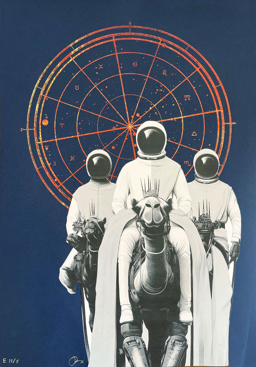 The work springs from one of the artist’s insights: the Magi do not reach the stable and the divine through religion, but through science. These enigmatic figures—magicians, scholars, kings from the East—arrive in Bethlehem by following the stars, reading the sky and interpreting the message of the comet.