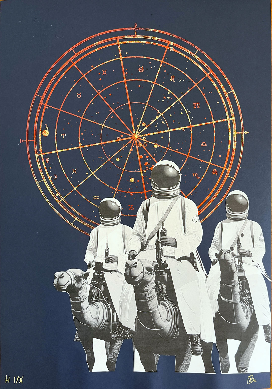 The work consists of 9 unique collages, each produced in an edition of 10 pieces and 4 artist’s proofs. Created through a combination of screen printing, metal leaf, and cut-and-pasted printed elements, these works explore a technique that brings together artisanal precision and painterly depth. Each piece is unique, with variations that heighten the visual and narrative intensity of this modern “cosmic epiphany”.