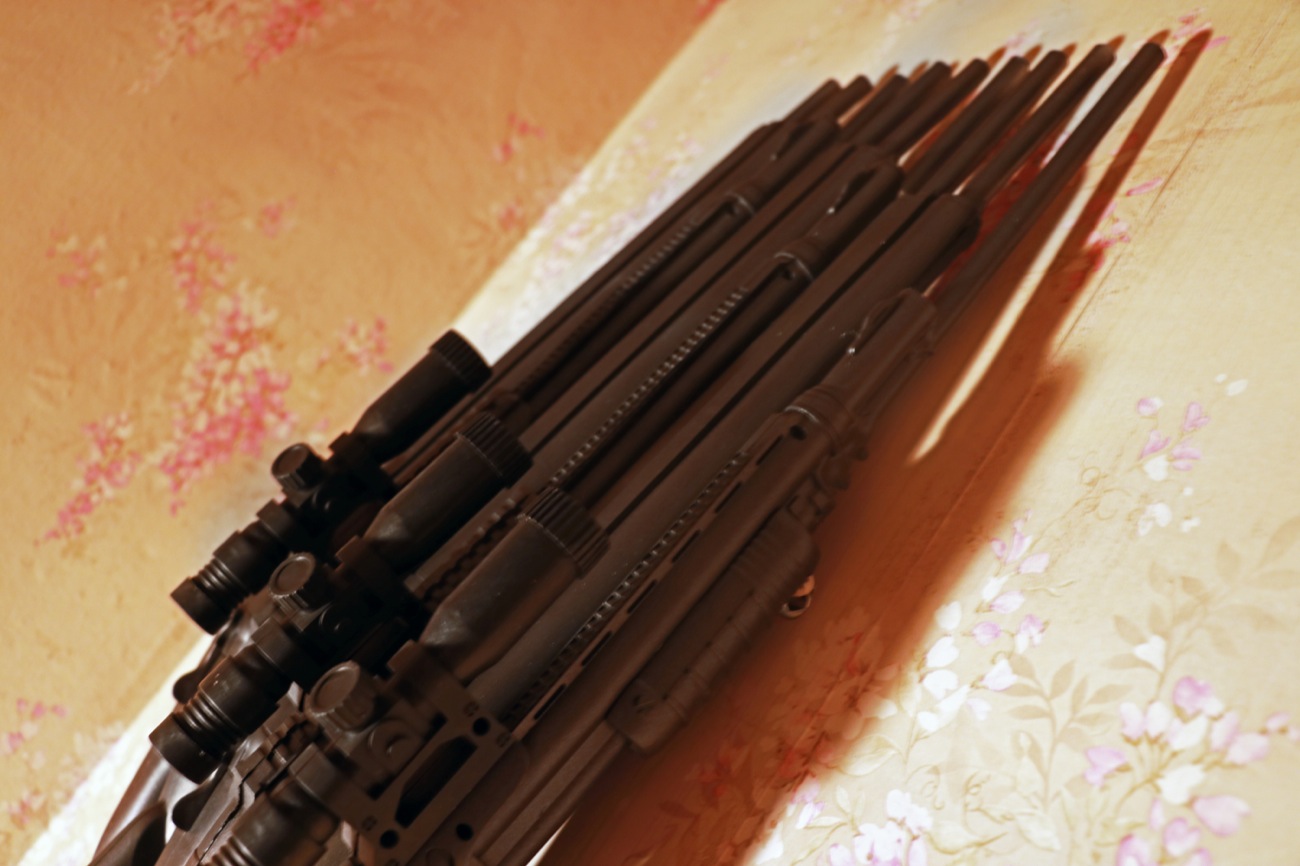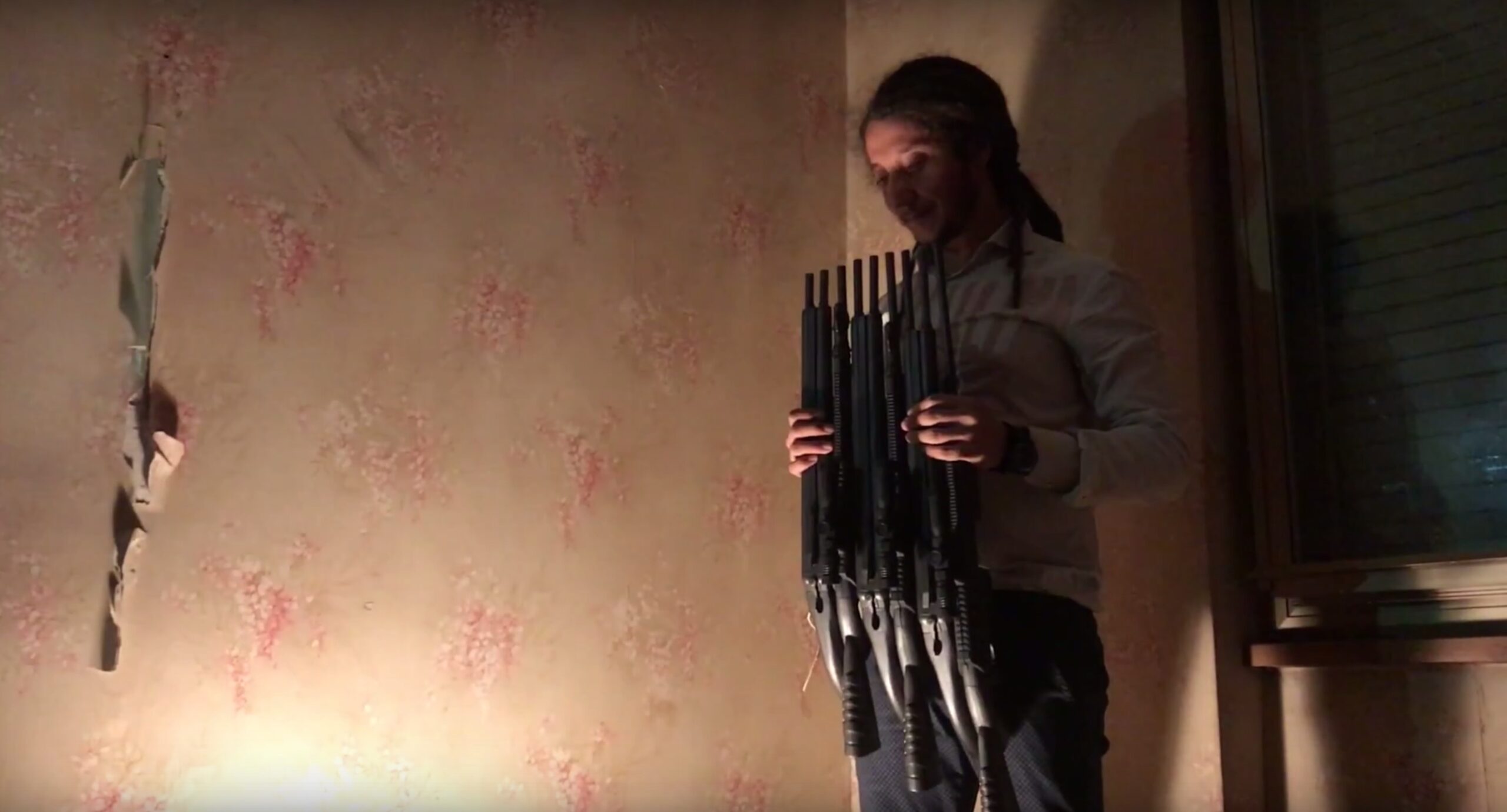 On nine simple toy rifles are inserted metal canes which have been tuned to produce, when blown, a specific sound corresponding to one of the pentagram’s notes. Rifles are glued together, creating a unique Pan’s flute which Filippo Riniolo plays, performing “Bella Ciao” partisan song, accompanied by a Kurdish chorus recording, in a poetic and poignant performance.
