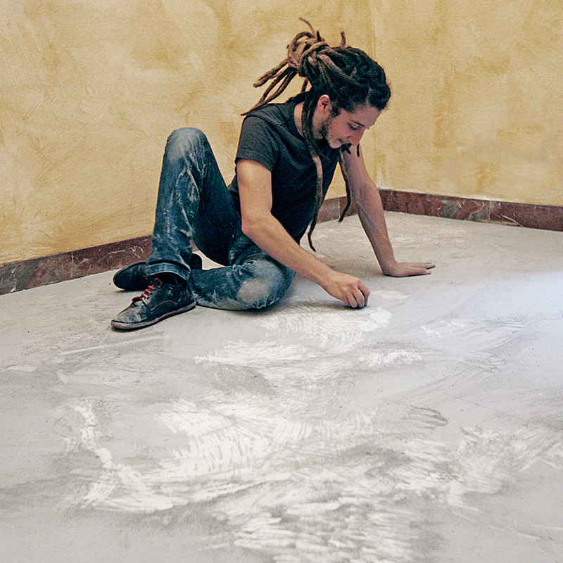 Sisyphus is a performance consisting in scratching with a coin, the floor of a room covered in silver film.