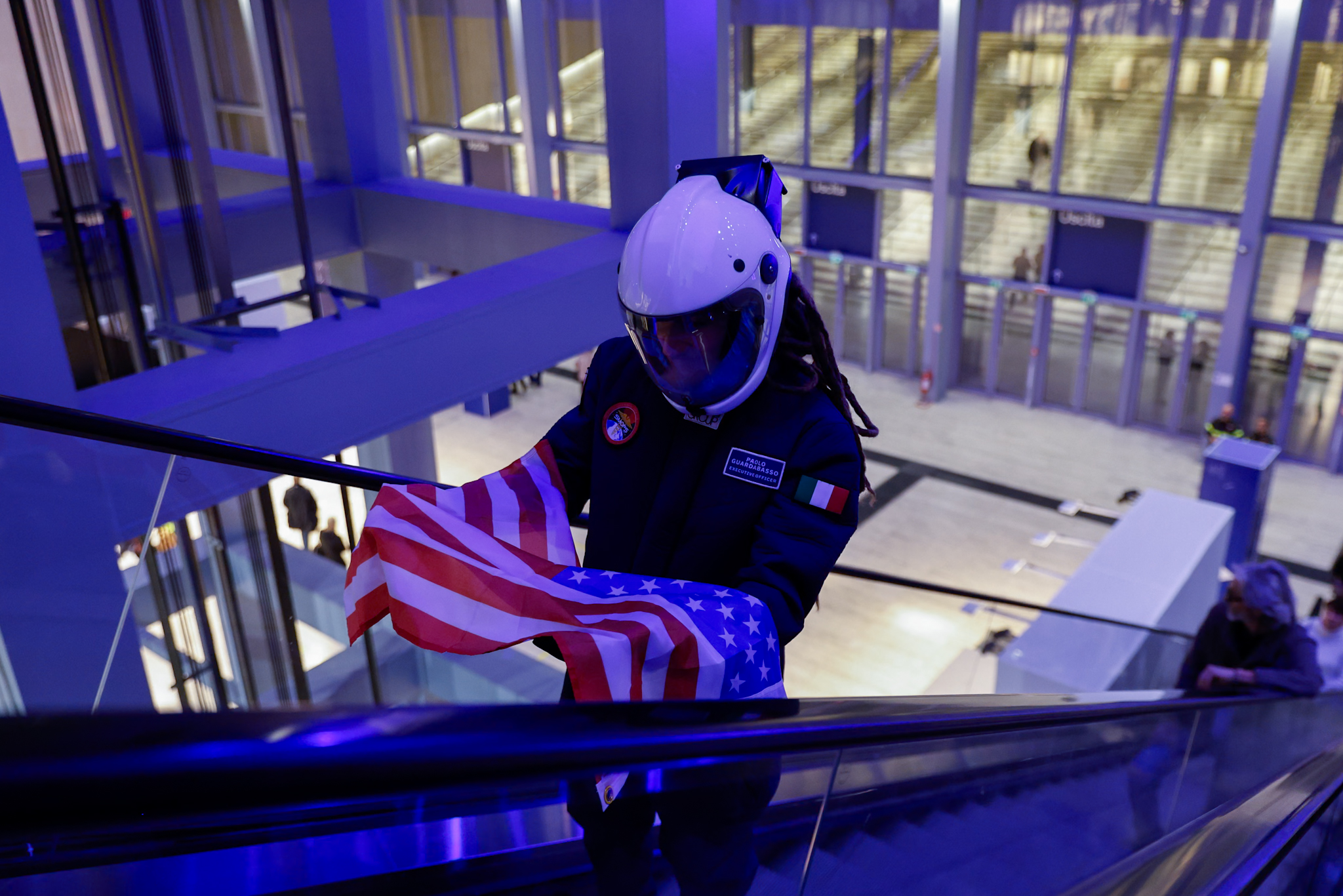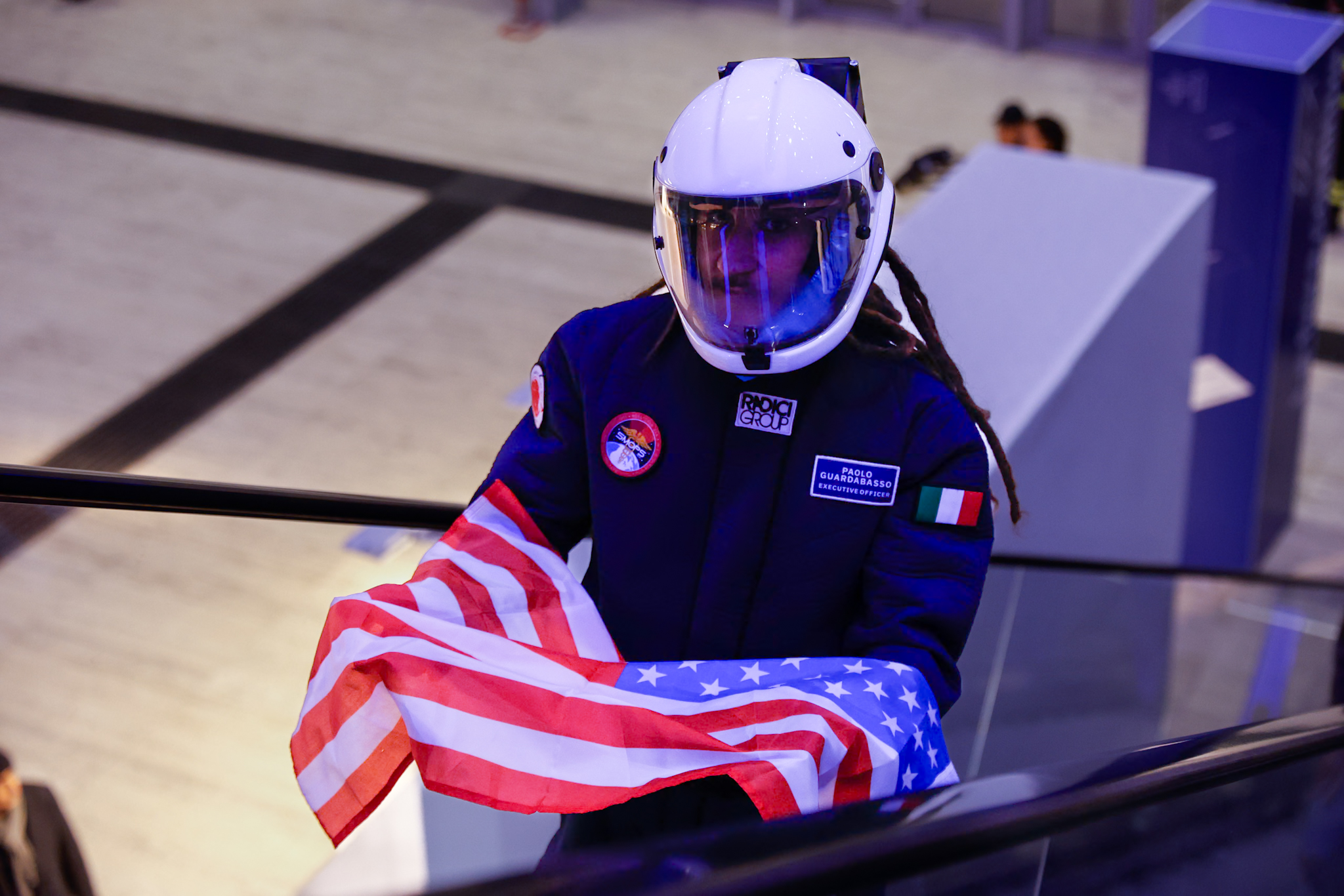 Wearing an original spacesuit, Filippo Riniolo entered the fair space carrying a folded United States flag. The scene was accompanied by a heterogeneous soundtrack that interwove radio signals, heightening the sense of suspension, composed especially for the occasion. He then took his place next to the journalist Corrado Formigli, host of Piazzapulita (La7), who was waiting for him on stage.