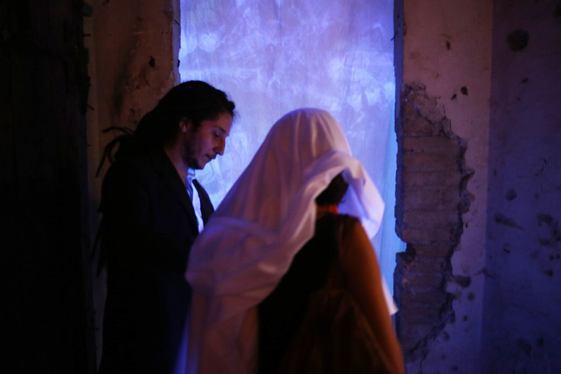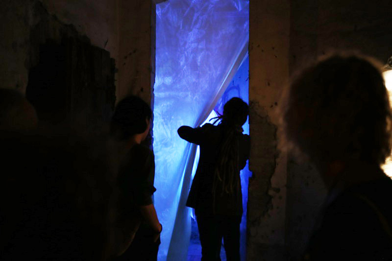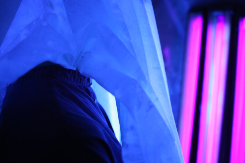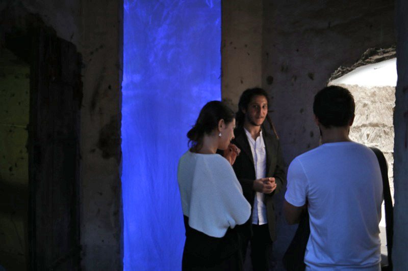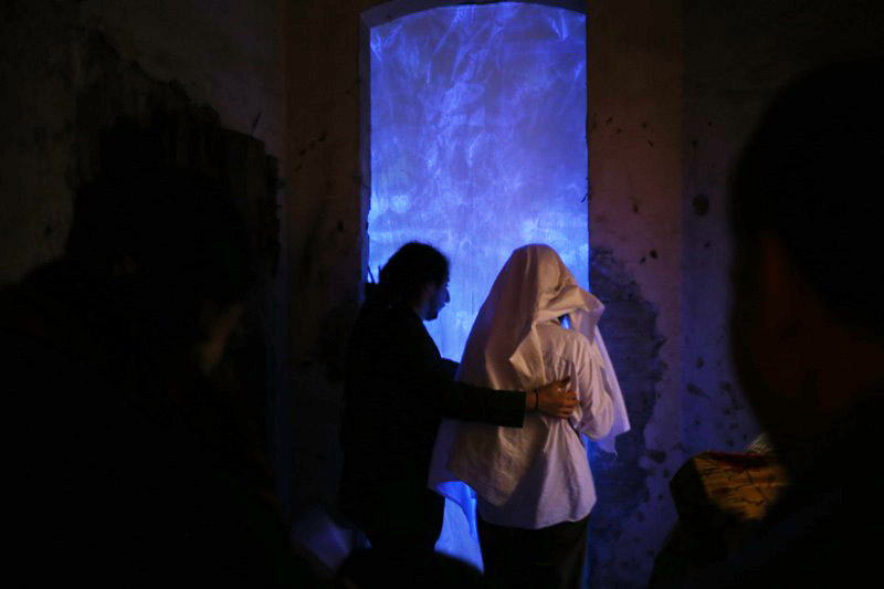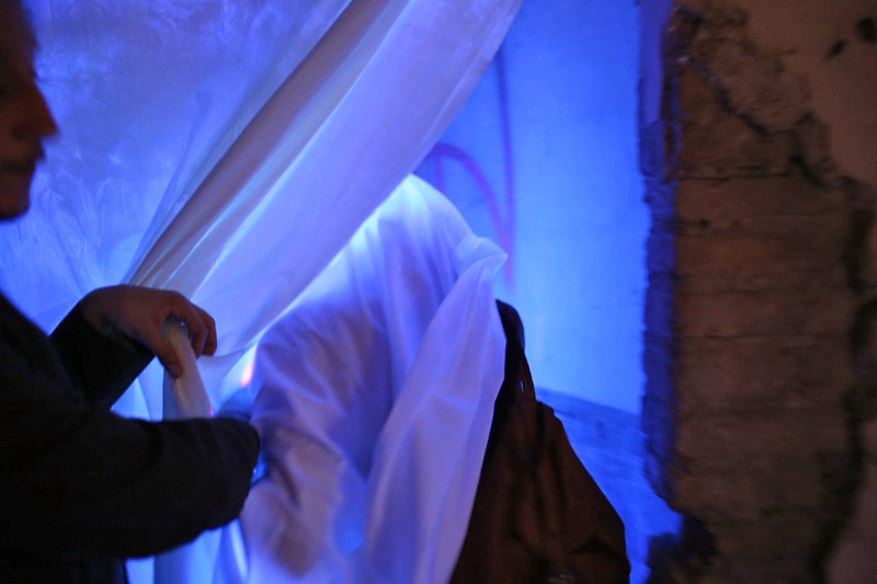 Teresa is a work in the middle between the installation and performance. The work is inspired by the ecstasy of St. Theresa , through which she accesses to the holy sacred , that you can not see . The sacred is the ontological “other”. As more of us there we can access with normal sensory perception . It is the sky that we can not aspire. The user is greeted by the front of the work and , after signing a release, is covered with a white linen cloth . Subsequently , the user can enter the room where he faced an ultraviolet light so intense that if you see no veil it would burn the corneas . That is way , the user can watch everything except for watching in to the light .