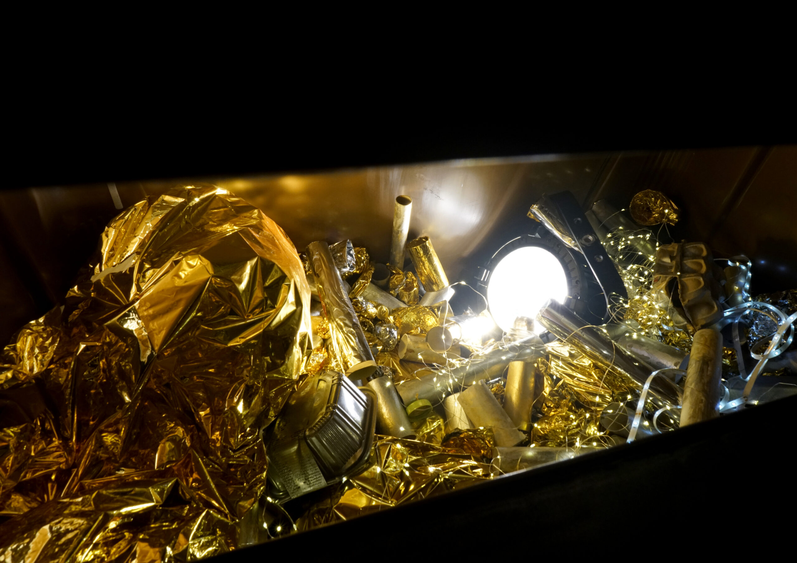 L’opera nasce dal ripensare i rifiuti come risorsa, iniziando proprio dal reinterpretare il cassonetto della spazzatura, dipinto come uno scrigno del tesoro. Il nome di questo cassonetto è Leonia, una delle città invisibili di Calvino, protagonista di una sovrapproduzione di rifiuti, che comprende l’impossibilità di continuare a produrli e modifica il suo approccio.