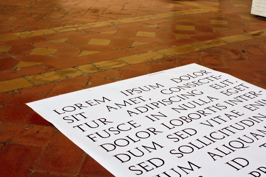 Tre stampe di dimensione 1m x 6 m, riportano un testo latino del 45 a.C. denominato Lorem ipsum, utilizzato sin dal 1500 come “finto testo” nella realizzazione di grafiche. Una funzione di riempimento, che assolve con efficenza, in quanto visivamente simile ad un testo significativo, ma assolutamente privo di qualsivoglia significato.